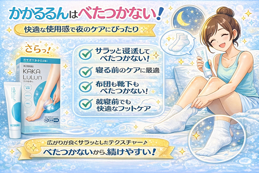 かかるるんってべたつくの?フットケアクリームって塗った後にベタベタするイメージがありますよね。 実は、かかるるんは多くの方が「べたつかない」と評価している、サラッとした使用感が特徴のクリームなんです。 塗った直後でも靴下を履けるほどのテク... -